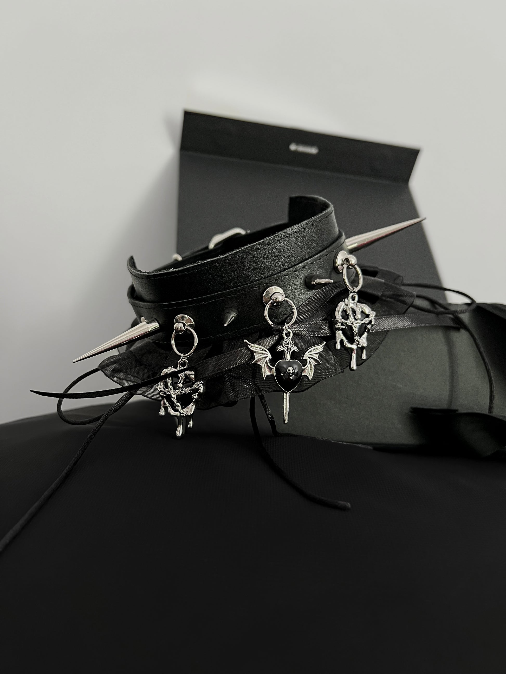 Choker structuré en cuir noir, rehaussé de clous coniques et de trois breloques sculpturales couleur acier : cœurs enchaînés et dague ailée. Finitions organza et ruban satinés soulignent une esthétique dramatique et envoûtante.